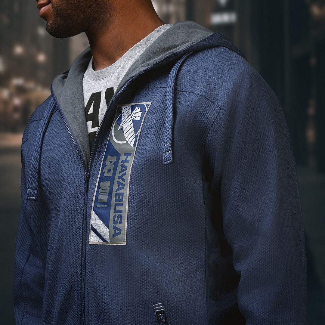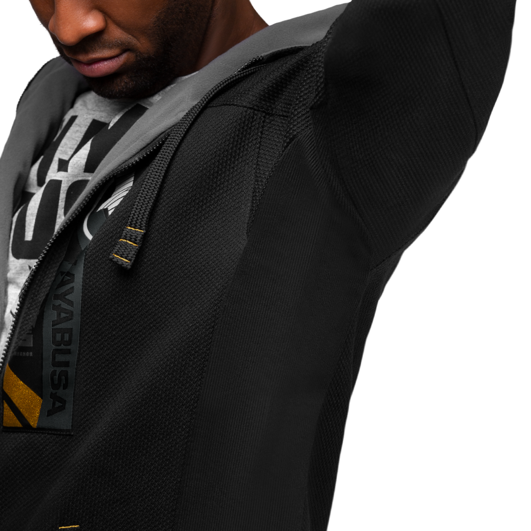 The Uwagi Pro Gi Jacket is the perfect hooded jacket for any climate with a unique jiu jitsu gi exterior and extra warm fleece lining.